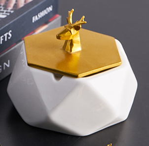 Cendrier Nordique en céramique. Magnifique cendrier Nordique avec bord en dorure et son couvercle en bois doré avec ca magnifique tête de cerf.