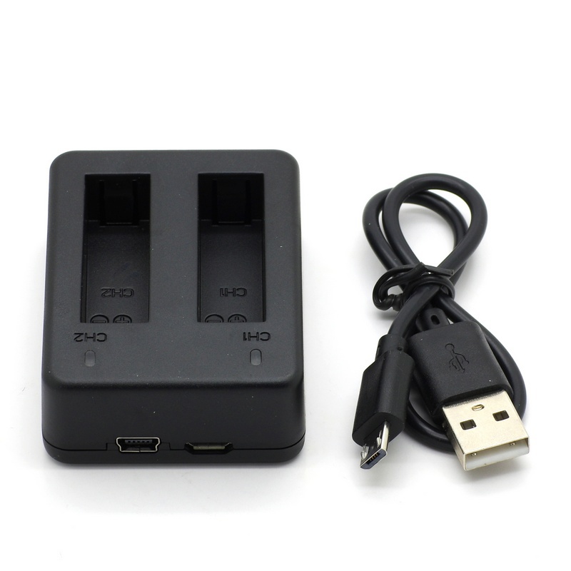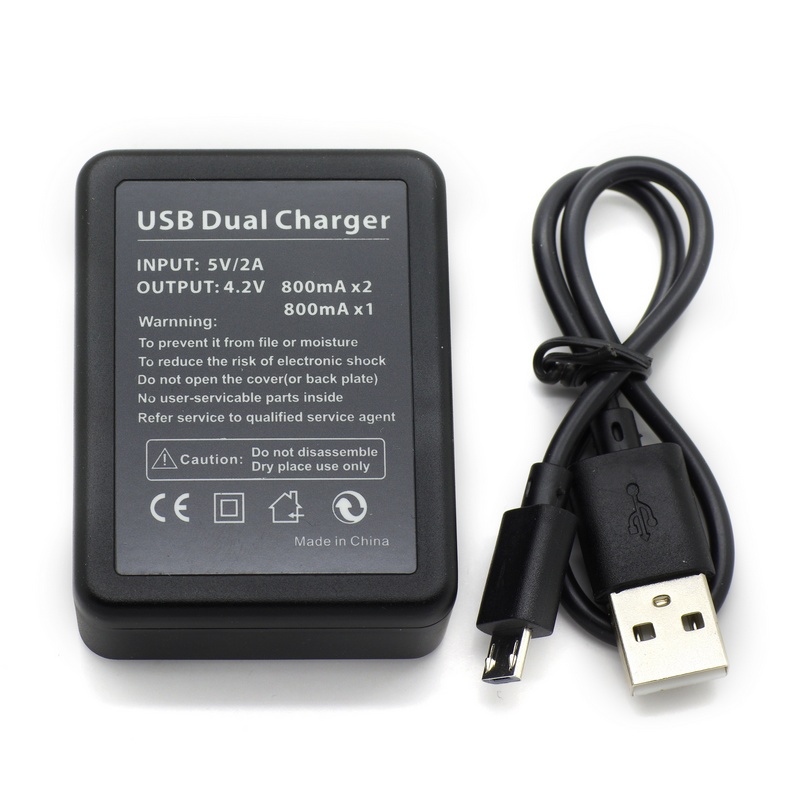 Chargeur pour 1 ou 2 batteries de GoPro HERO4, câble USB inclus (avec 2 entrées USB, possibilité d’utiliser donc au choix le câble USB inclus ou le câble USB de votre GoPro).