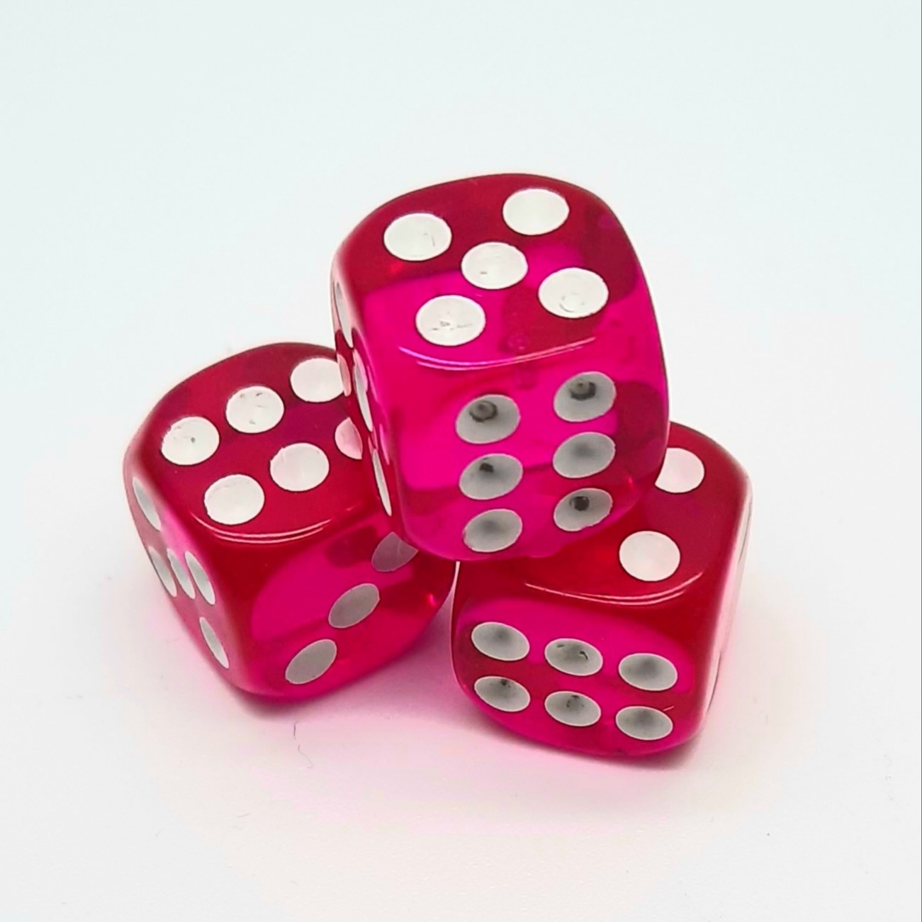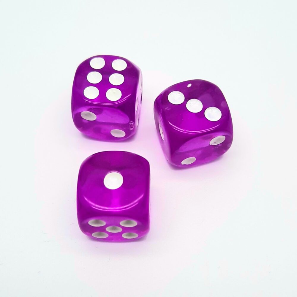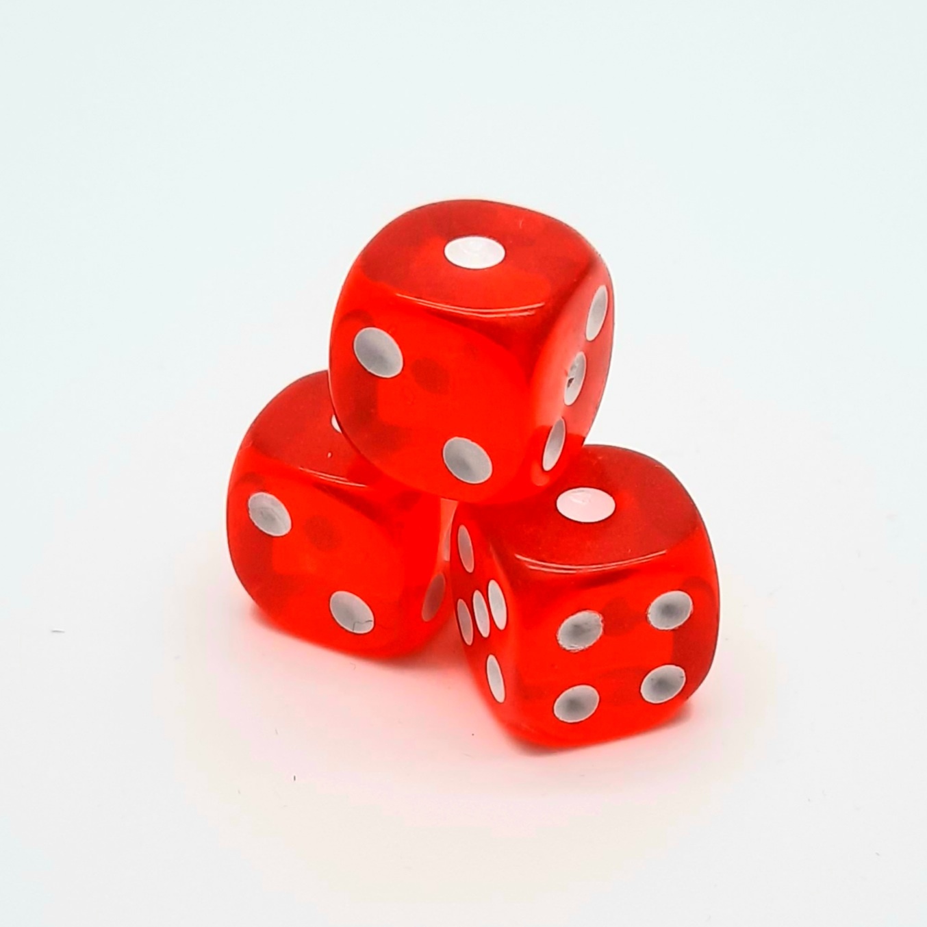 Dés translucides de couleur. Dés en plastique transparent coloré de 10 mm avec les points de 1 à 6. Beaux dés à jouer pour tous vos jeux. Dés brillants où l’on voit à travers avec des points blancs. Dés à jouer pour jeux de société. Avec coins arrondis.