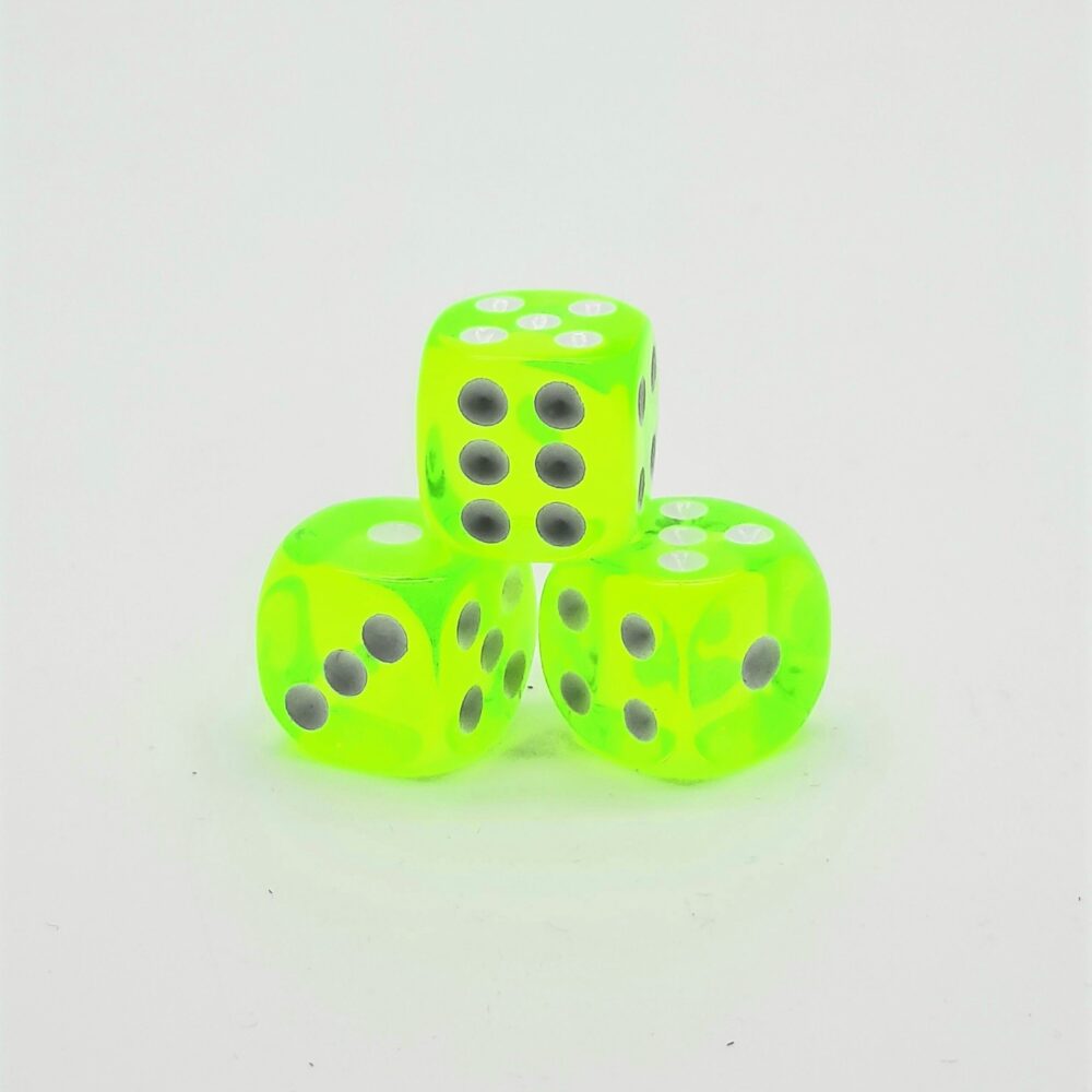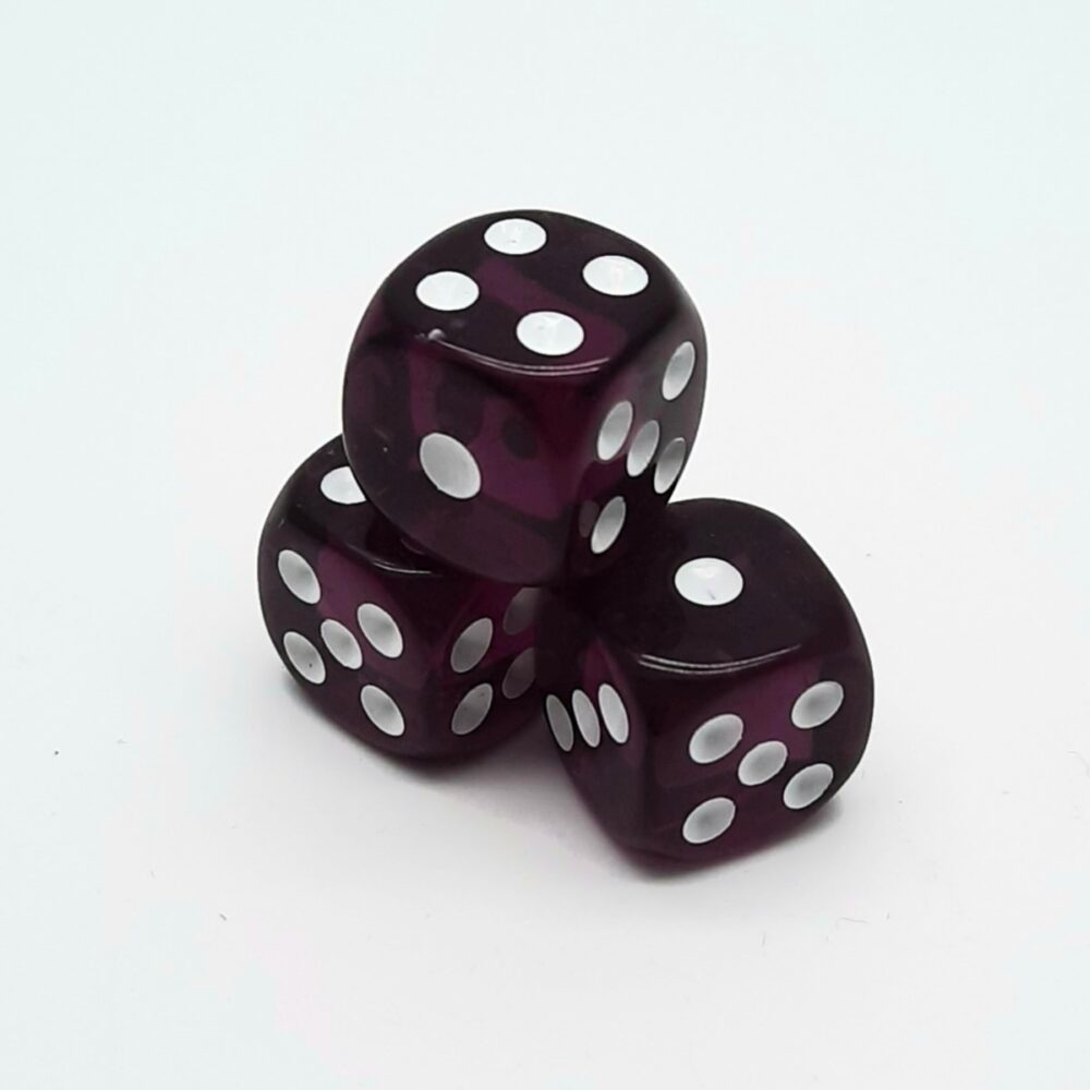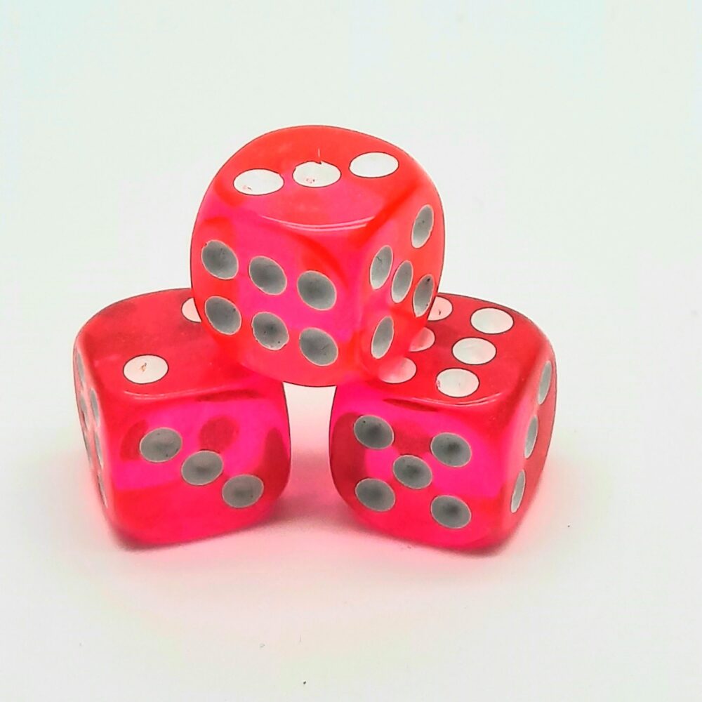 Dés translucides de couleur. Dés en plastique transparent coloré de 10 mm avec les points de 1 à 6. Beaux dés à jouer pour tous vos jeux. Dés brillants où l’on voit à travers avec des points blancs. Dés à jouer pour jeux de société. Avec coins arrondis.