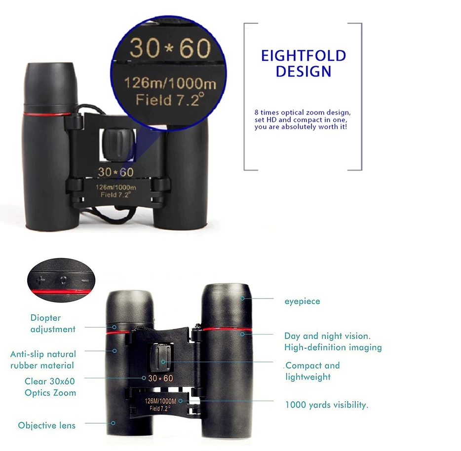 Jumelles zoom 1.30X60. Livré avec un sac de transport noir.
