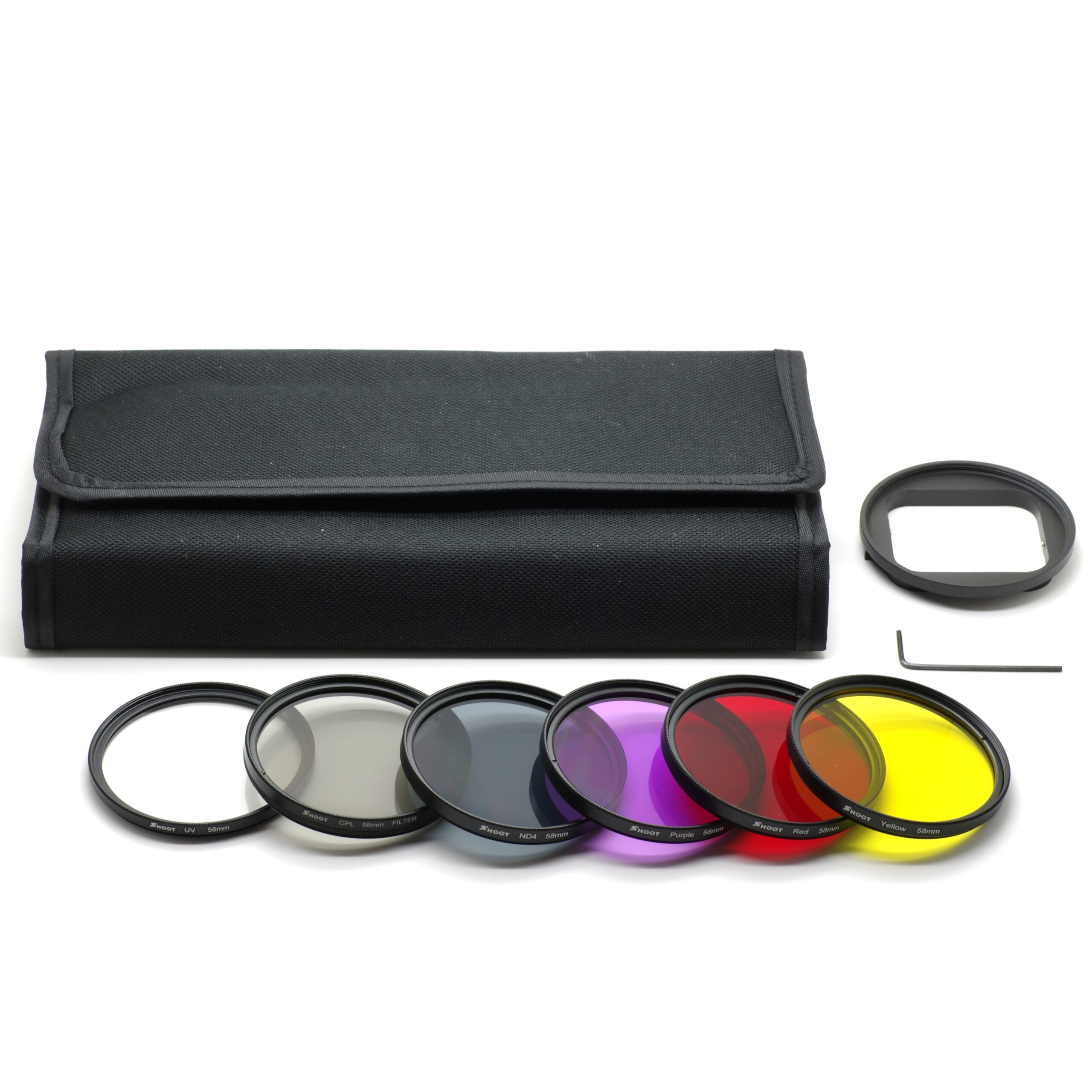 Kit de 6 filtres 58mm pour GoPro HERO7 Black, HERO6 et HERO5 avec support pour filtres 58mm, avec étui de rangement inclus.