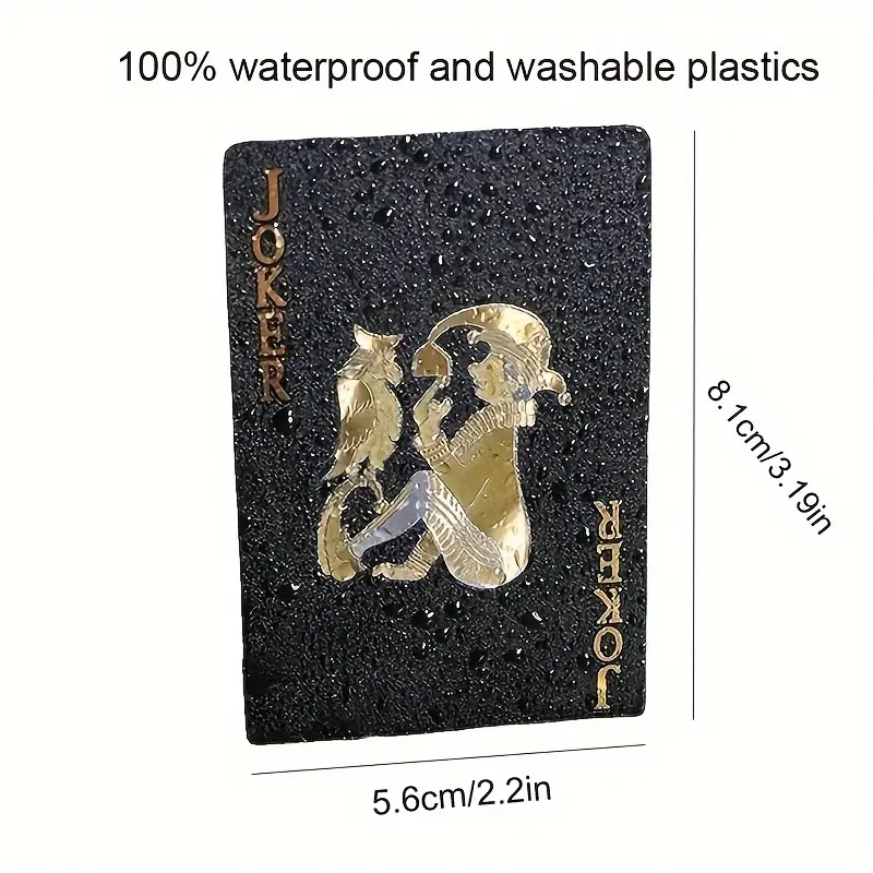 Plastique Durable Et Imperméable À L’eau Ce magnifique jeu de 52 cartes (+ 2 jokers) noir et dorée est entièrement plastifié (ce qui lui confère une bien meilleure durée de vie que les traditionnelles cartes en papier cartonné).
