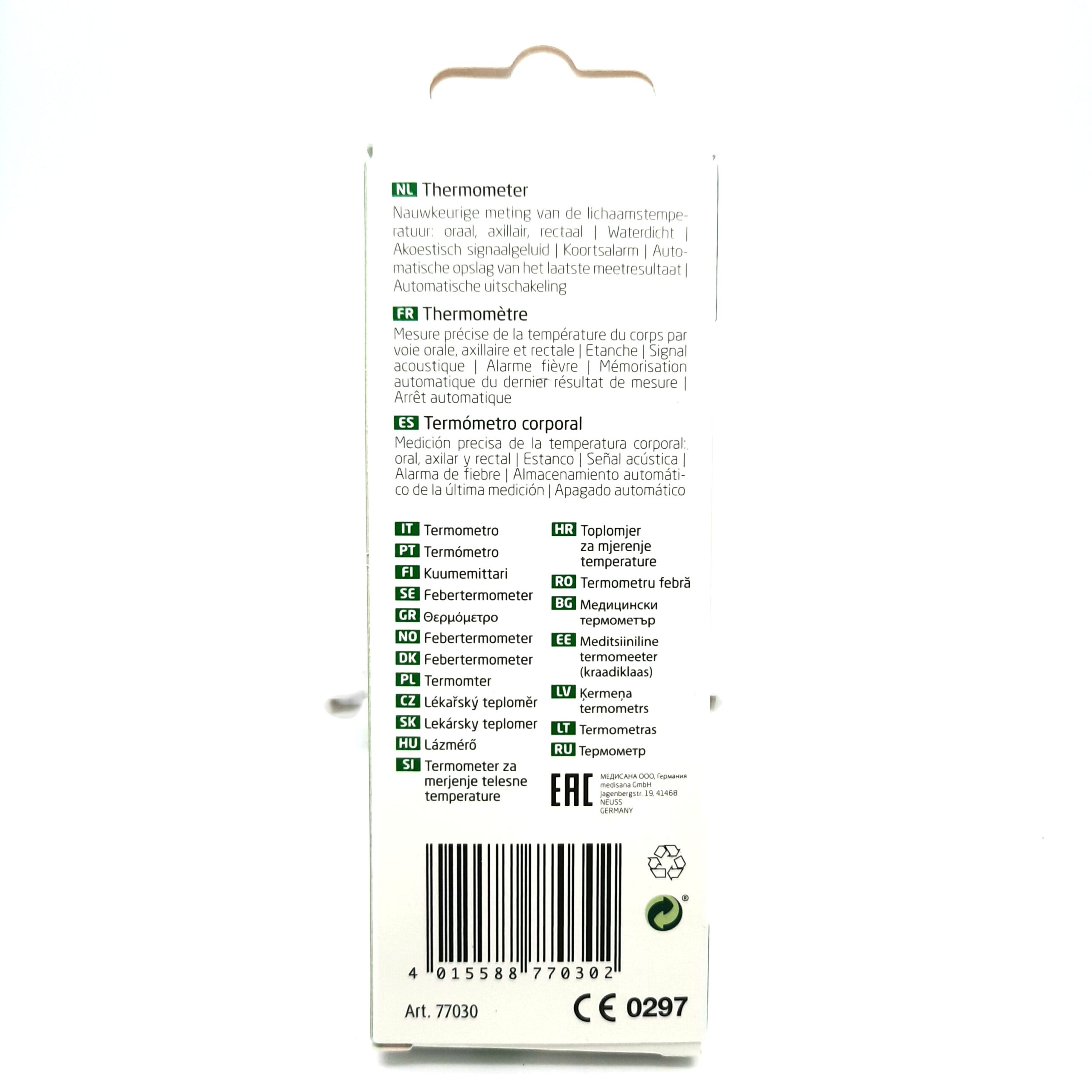 Thermomètre corporel. Mesure la température du corps par voie orale, axillaire ou rectale. Un signal acoustique en cas de fièvre. Une fonction automatique du dernier résultat de mesure est bien utile. Arrêt automatique. Etanche.